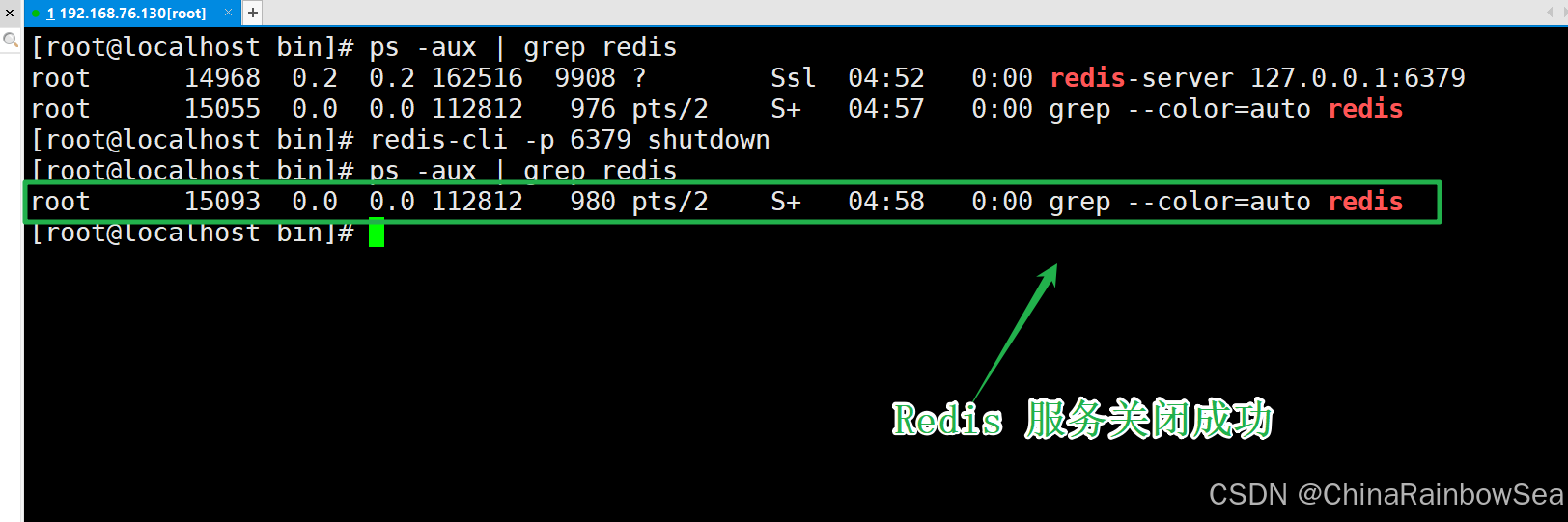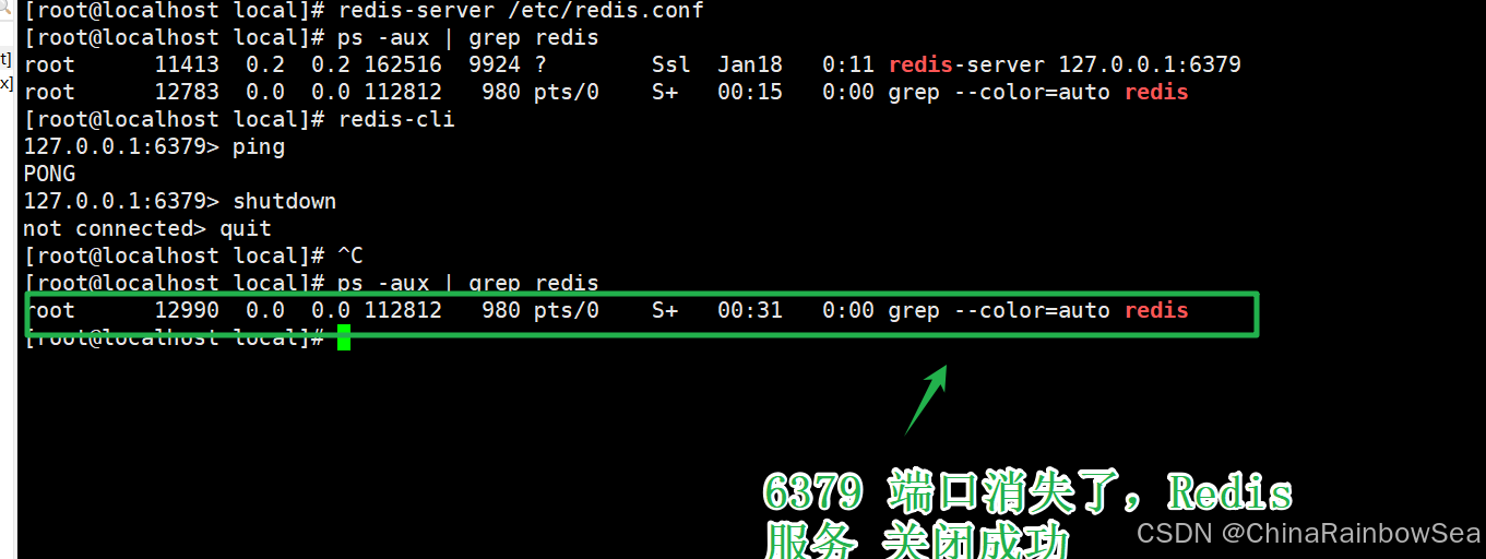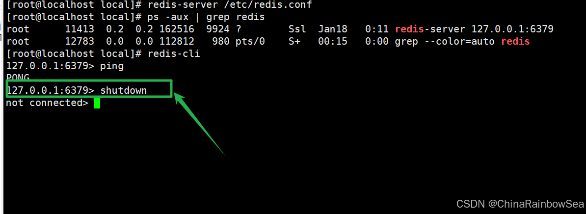 通过 [root@localhost ~]# redis-cli shutdown 命令关闭, Redis 服务