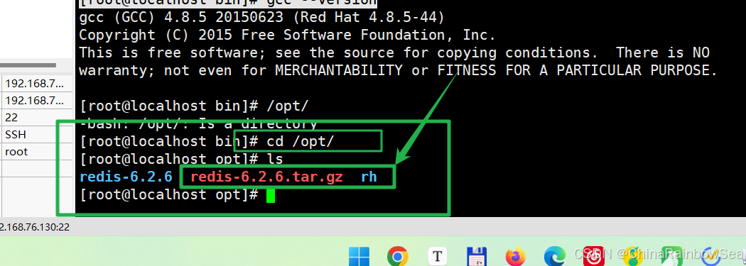 因为我们通过 xftp 软件将,redis 安装包放到了 Linux 当中的 opt 目录当中了,我们需要进入到这个 opt 目录当中。