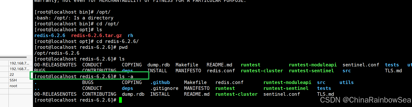 ls -a查看目录下的全部文件内容,包括隐藏文件等。[root@localhost redis-6.2.6]# ls -a