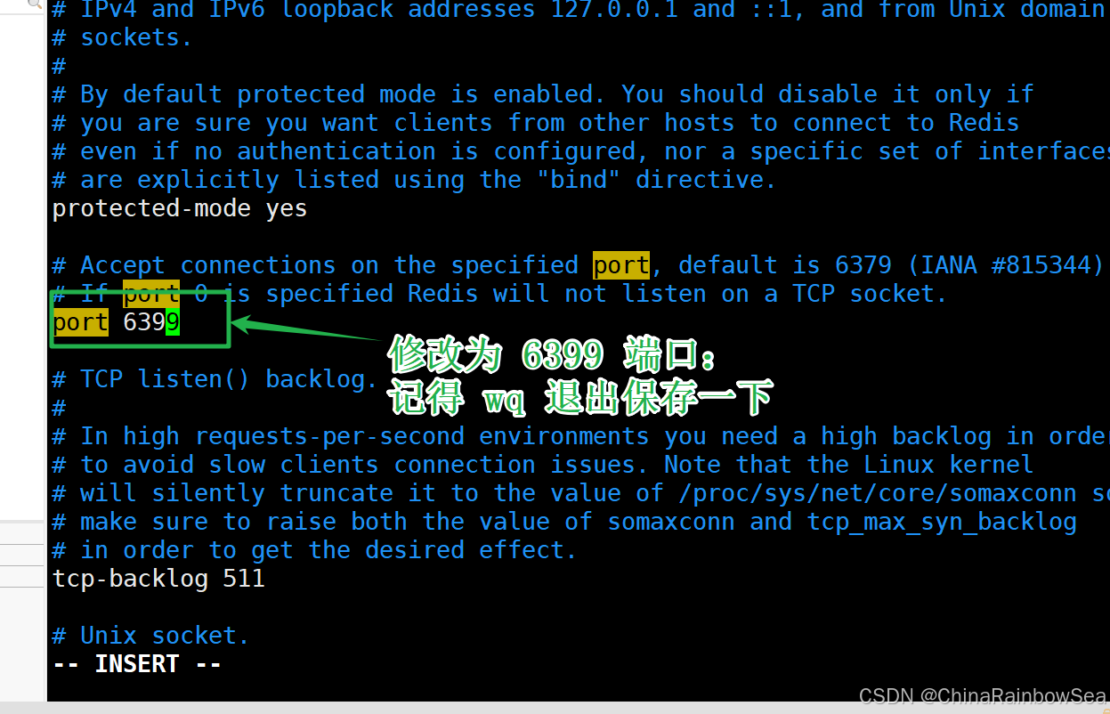 如下图所示:通过 `vim 进入到 /etc/redis.conf 文件当中,并进行编辑,修改 端口。