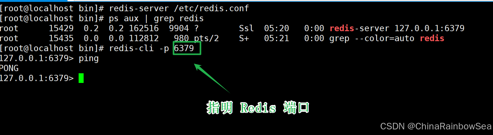 - 第二种方式:指明 Redis 客户端的端口,如果 Redis 端口被修改了,则必须采用这种方式才能启动/进入到 Redis 客户端。(前提是 Redis 服务器是启动的)