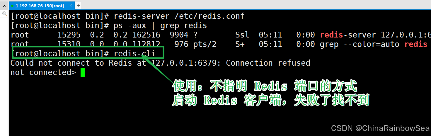 redis-server /etc/redis.conf将 Reids 服务器启动的话,你是无法进入到 Redis 客户端的。所以,进入 Redis 客户端的前提条件就是,Redis 服务器是启动的,不可以关闭。