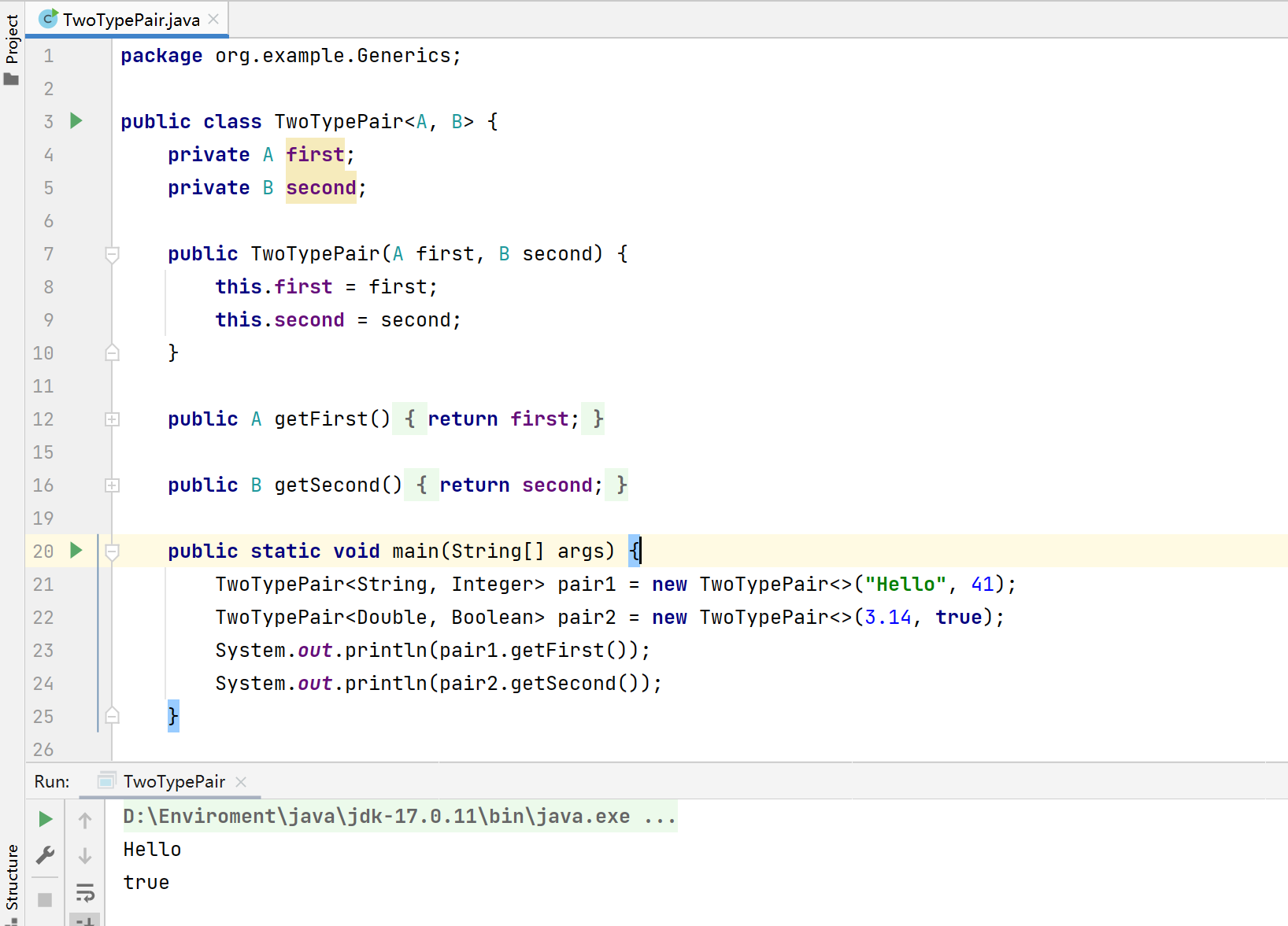 TwoTypePair<Double, Boolean> pair2 = new TwoTypePair<>(3.14, true);