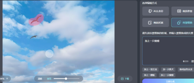局部替换功能更是充满创意。举个例子,要是你想把图片中的飞鸟替换成蜜蜂,操作起来非常简单,