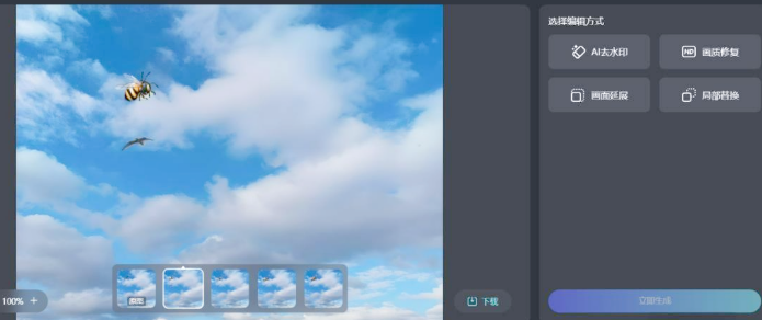 只要在界面上先涂抹要替换的区域,然后输入“加上一只蜜蜂”,再点击“立即生成”按钮,眨眼间,图片里的元素就完成了替换,轻松又有趣。