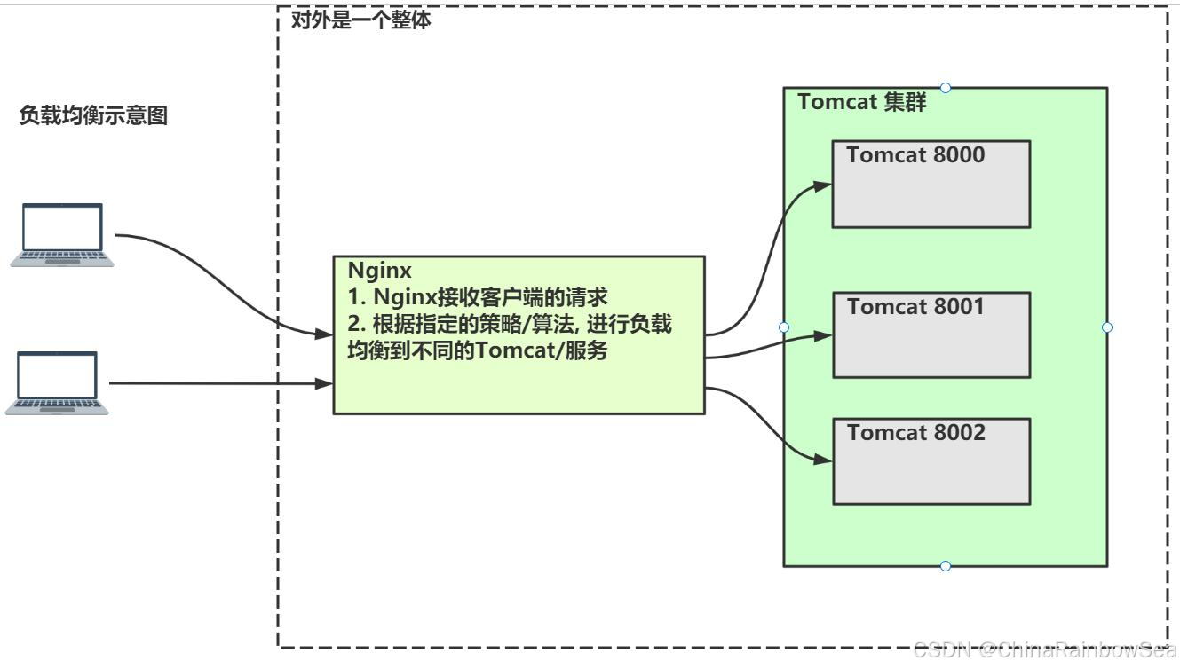 一句话:当客户端向反向代理服务器(比如 Nginx)发出请求,如果 Nginx 代理了多个 WEB 服务器(集群),Nginx 会将请求/负载分发到不同的服务器,也就是负载均衡 。