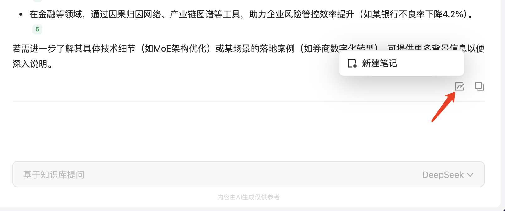 对于提问的结果可以新建笔记、复制:
