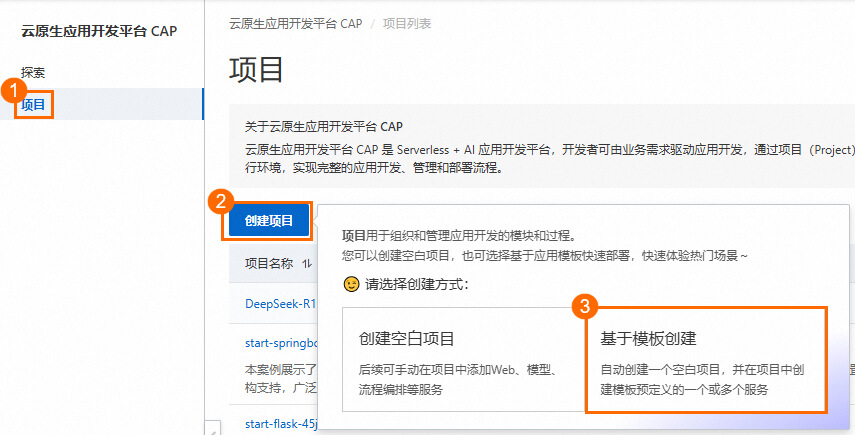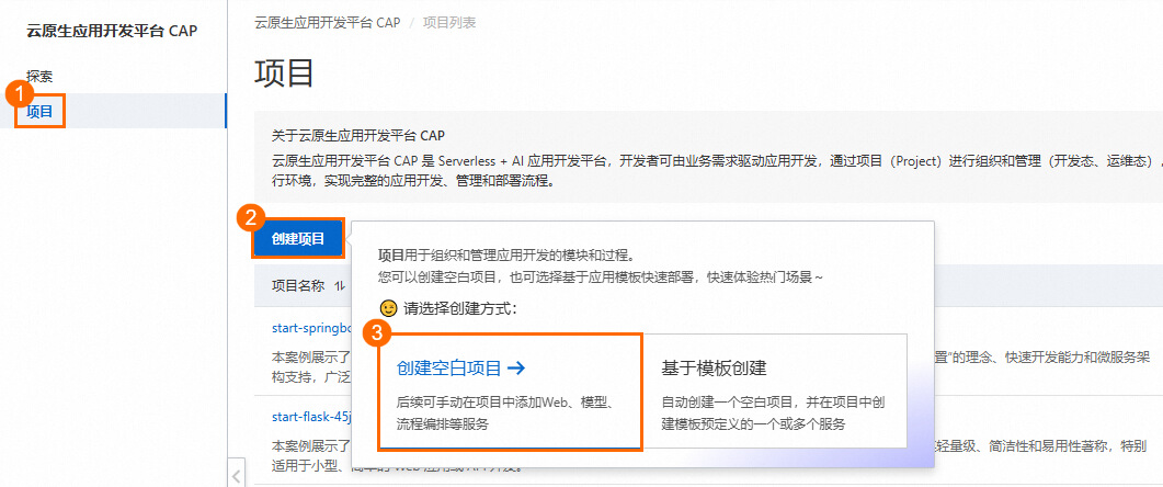 进入CAP控制台单击创建空白项目开始创建,并为项目命名。