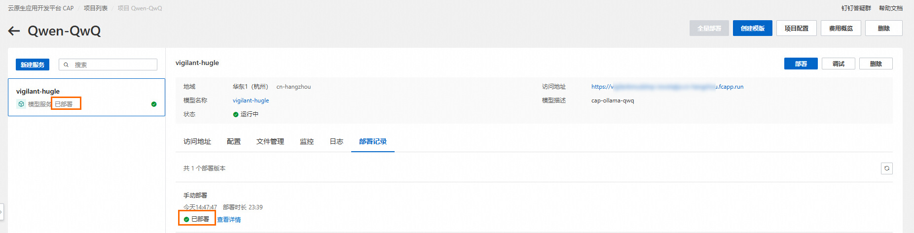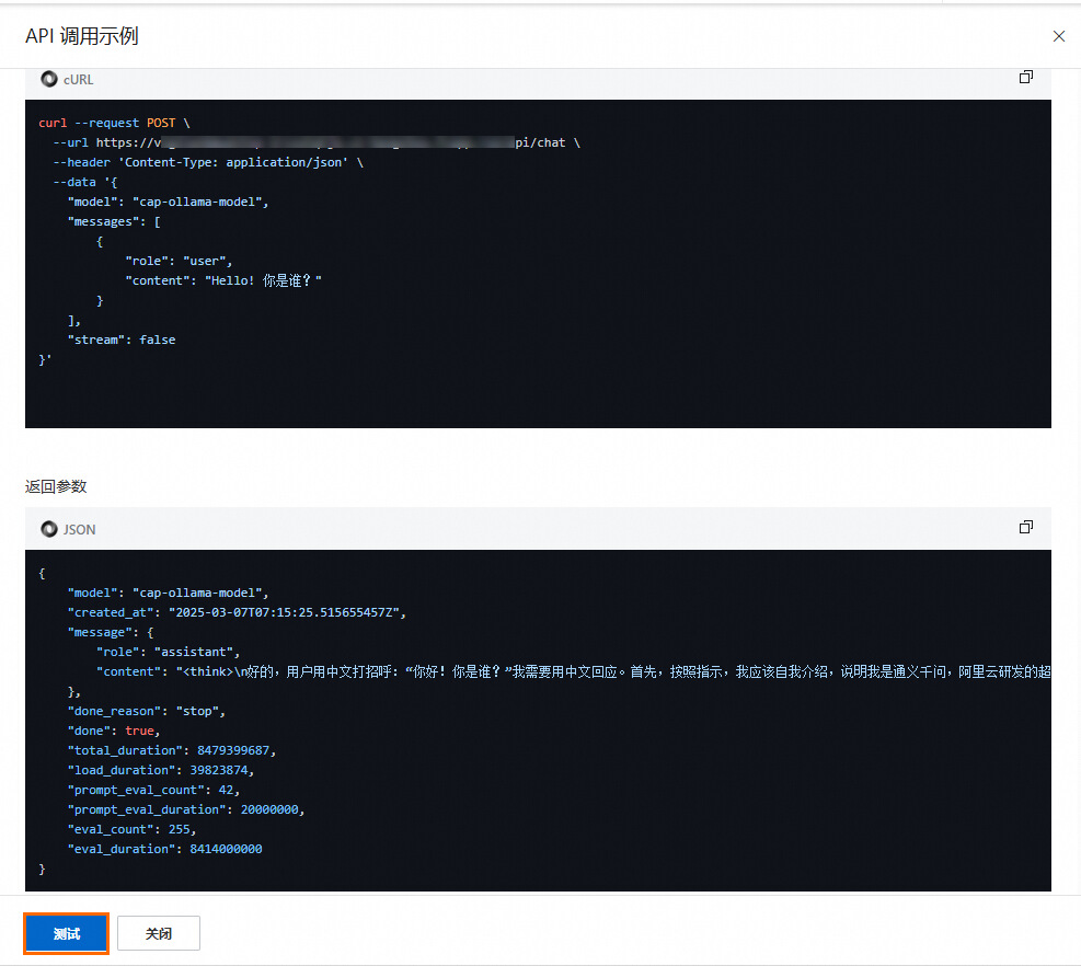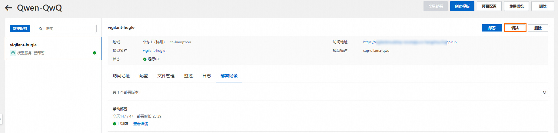 - 如果您在测试调用的过程中遇到部署异常或模型拉取失败,可能是当前地域的GPU显卡资源不足,建议您更换地域进行重试。