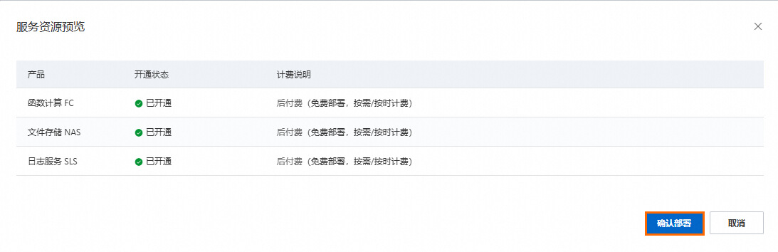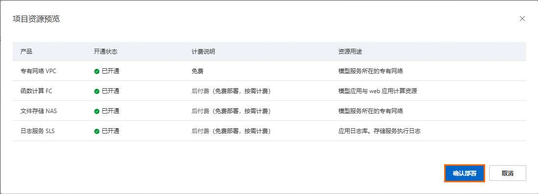 3.单击预览并部署,在服务资源预览对话框中,您可以看到相关的计费项,详情请见计费涉及的产品。单击确认部署,该阶段需下载模型,预计等待10~30分钟即可完成。