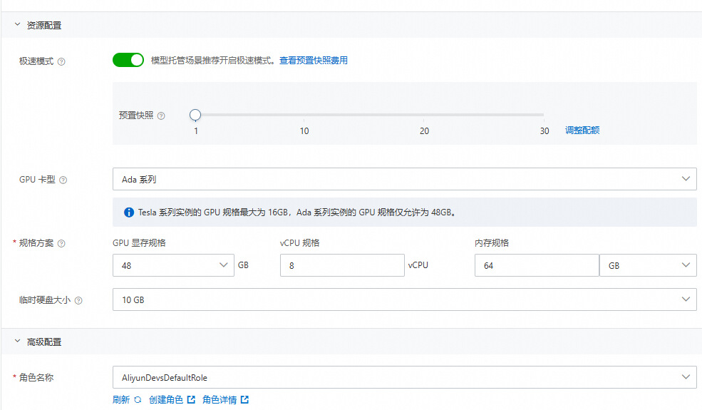 2.单击资源配置,QwQ-32B-GGUF推荐使用 Ada 系列,可直接使用默认配置。您可以根据业务诉求填写需要的卡型及规格信息。