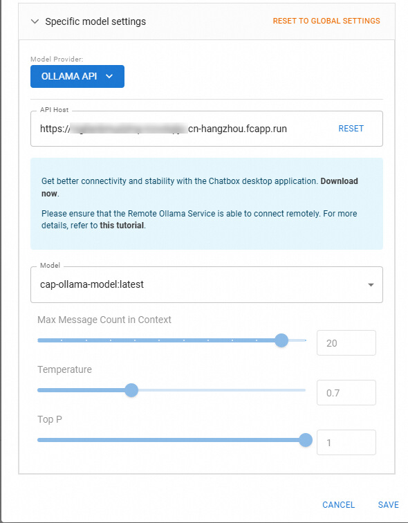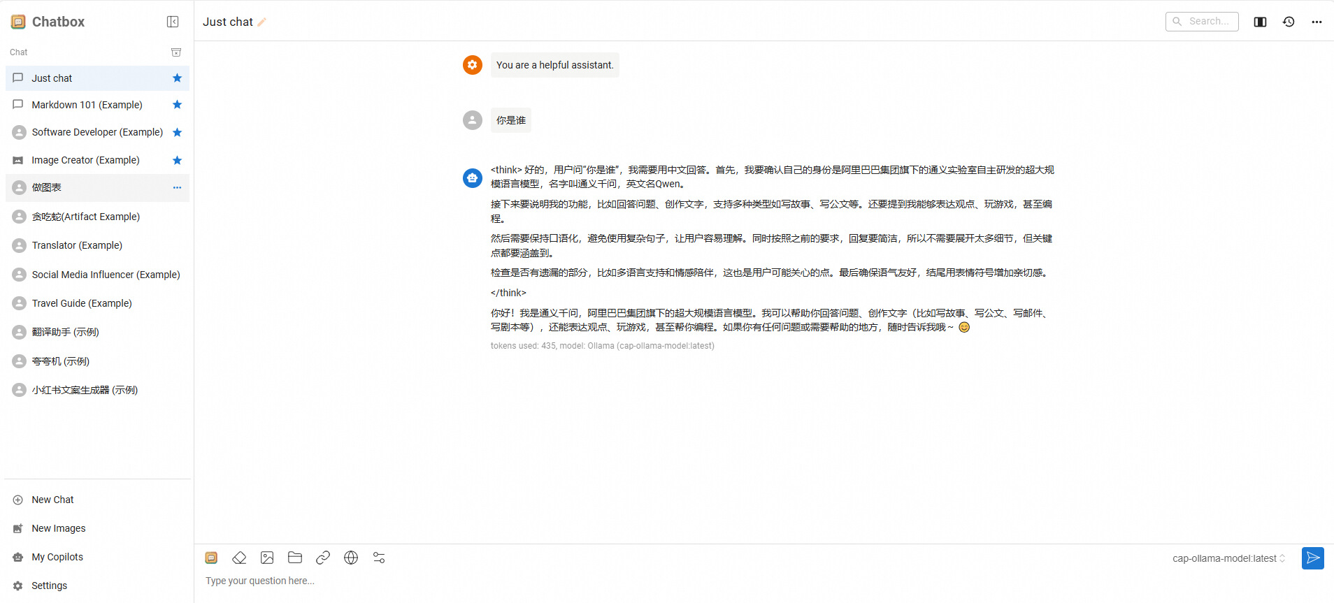 您可以选择在Chatbox等其他第三方平台中验证和应用模型调用,以下以Chatbox为例。