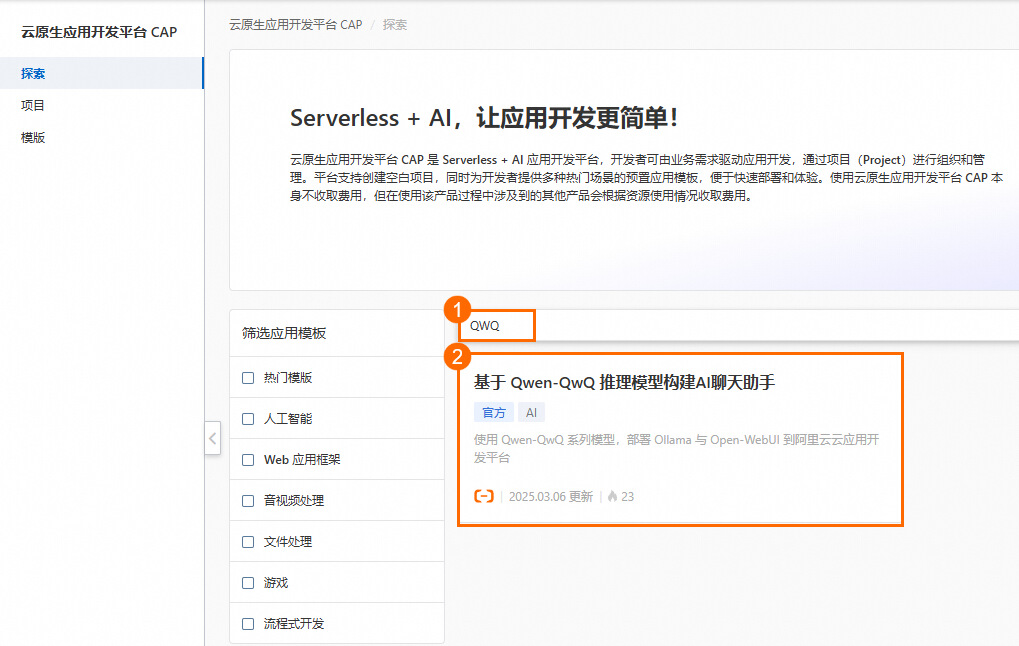 QwQ-32B推理模型正式发布并开源,凭借其卓越的性能和广泛的应用场景,迅速在全球范围内获得了极高的关注度。基于阿里云函数计算 FC提供算力,Serverless+ AI 云原生应用开发平台 CAP现已提供模型服务、应用模板两种部署方式辅助您部署QwQ 32B系列模型。您选择一键部署应用模板与模型进行对话或以API形式调用模型,接入AI应用中。欢迎您立即体验QwQ-32B。