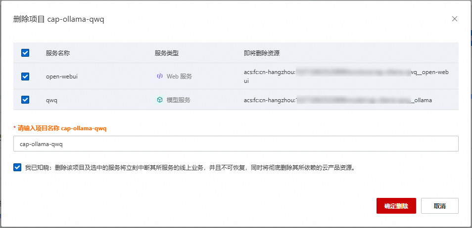 勾选我已知晓:删除该项目及选中的服务将立刻中断其所服务的线上业务,并且不可恢复,同时将彻底删除其所依赖的云产品资源,然后单击确定删除。
