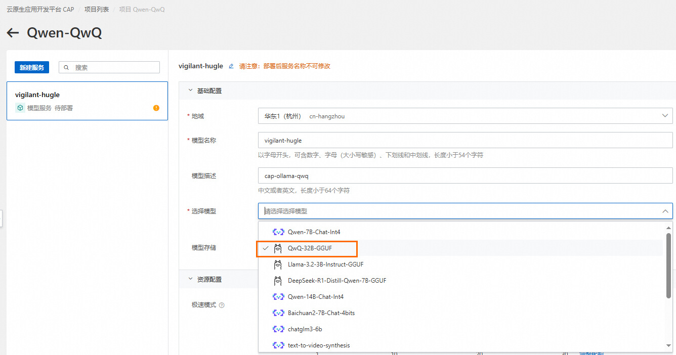 1.选择模型QwQ-32B-GGUF,目前仅支持杭州地域。