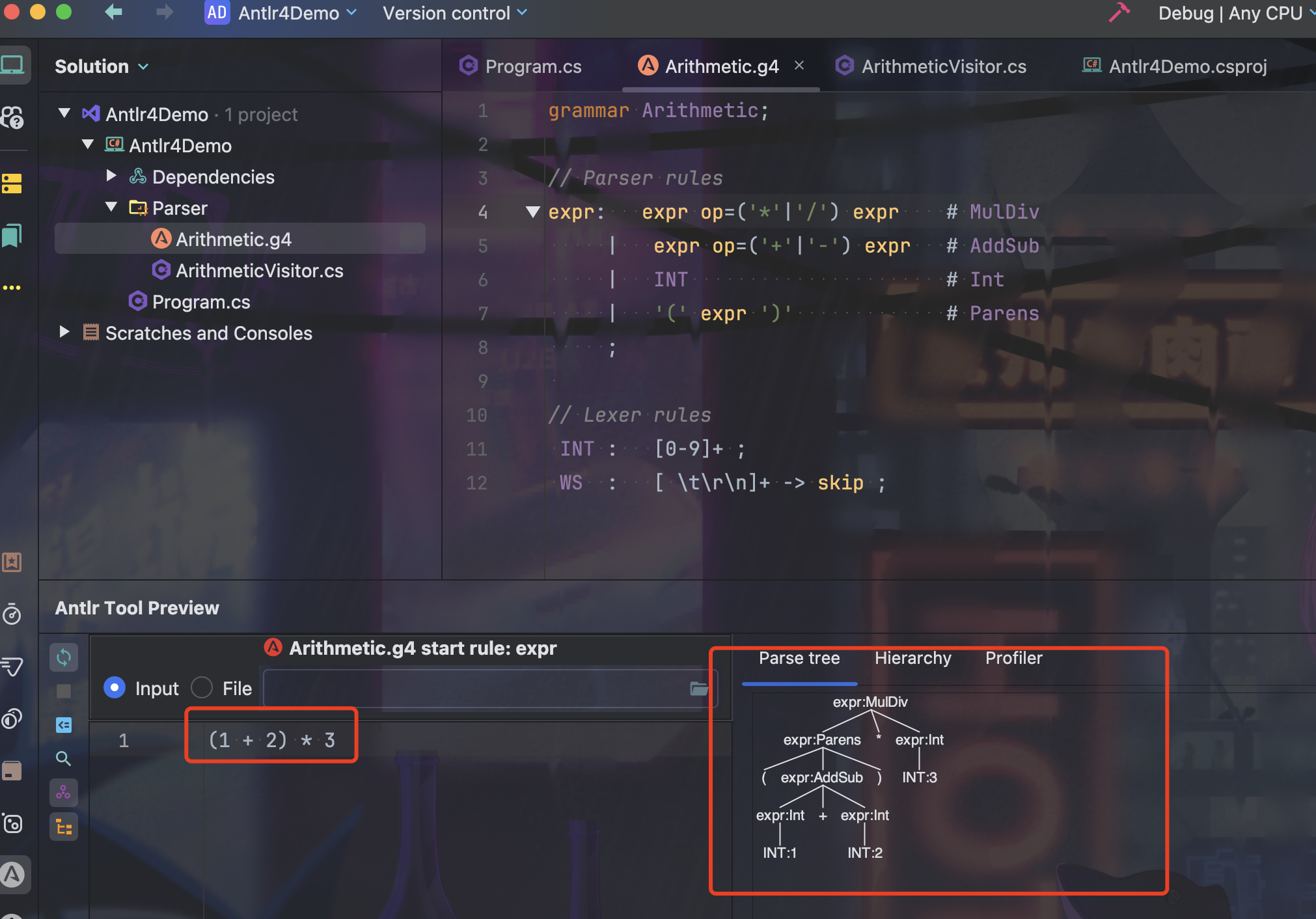 其中,Arithmetic.g4 是我们编写的语法规则文件,-Dlanguage=CSharp 表示生成 C# 语言的语法分析器。