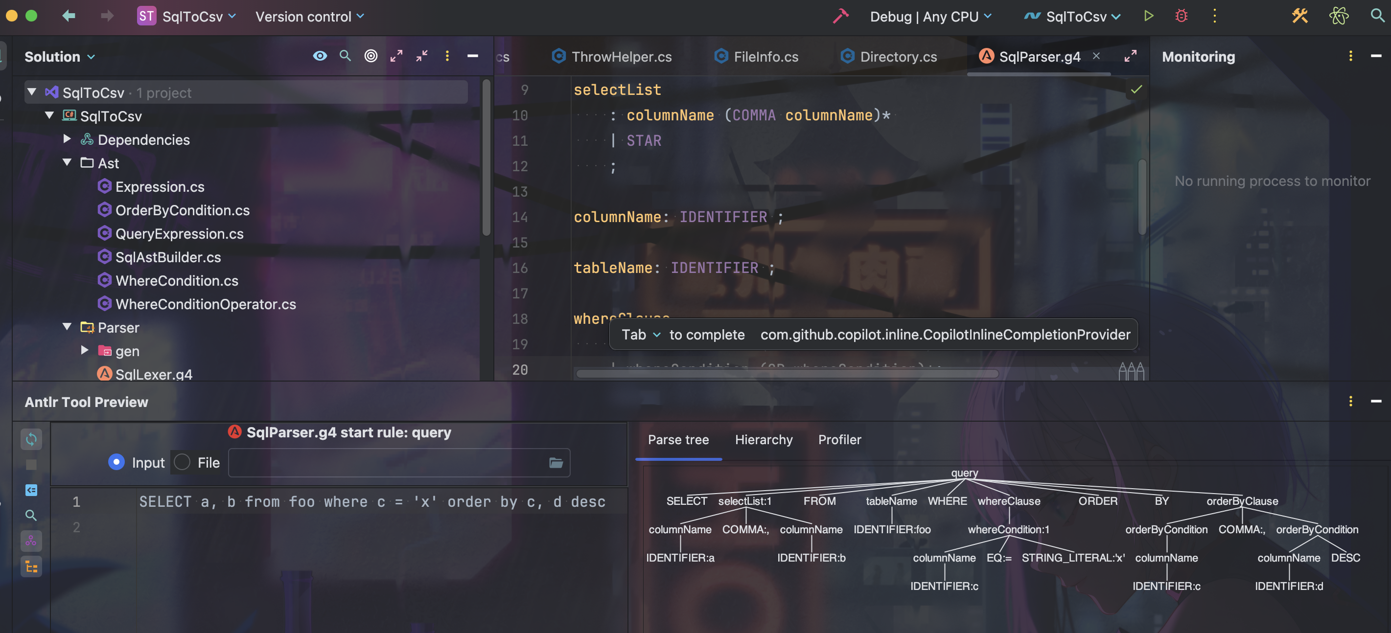 借助 Antlr4BuildTasks 项目自动生成语法分析器。#