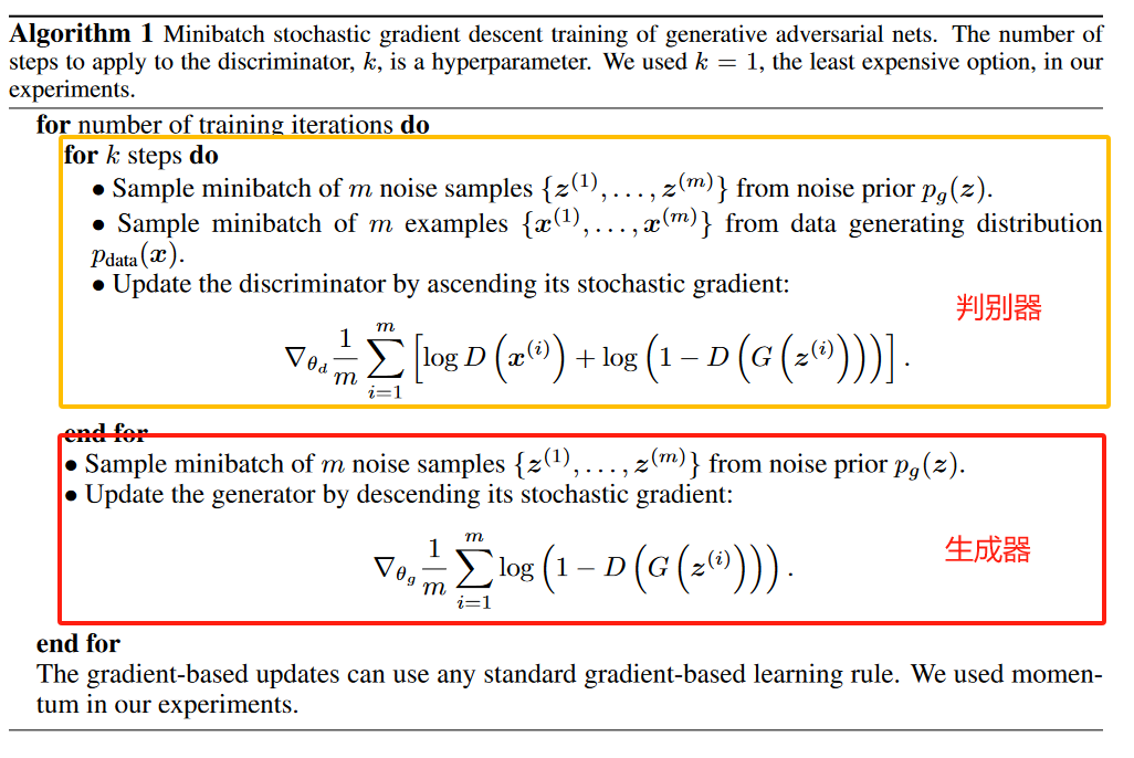- 训练判别器(D)的过程,循环 \(k\) 次: