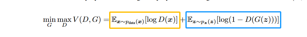 \[V = E_{x \sim P_{data} } \left [\ log\ D(x) \ \right ] + E_{x \sim P_{G} } \left [\ log\ (1-D(x)) \ \right ] \]