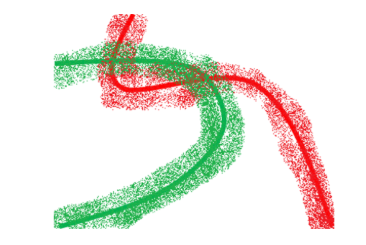 第二种情况,就是数据本身的特性。一般来说,生成器产生的数据都是一个映射到高维空间的低维流型。而低维流型之间本身就“不是那么容易”产生重叠的。如下图所示