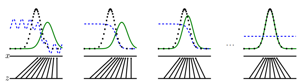 从左到右边:最开始生成模型所生成的效果不佳,判别模型可以很容易就判断出哪些是正式数据哪些是生成数据(蓝色线条代表判别模型给出的评分,最开始很容易判断出哪些是生成数据哪些是正式数据),但是随着模型迭代,生成模型所生成的内容越来越贴近正式的数据分布进而导致判别模型越来越难以判断。