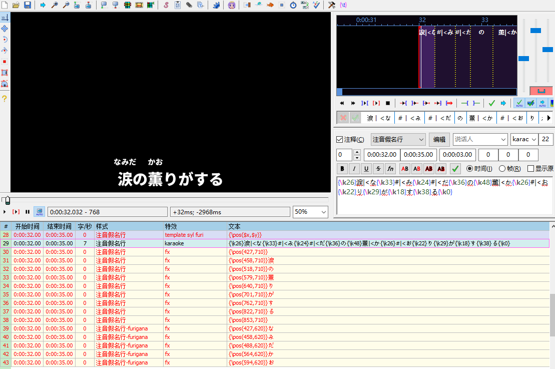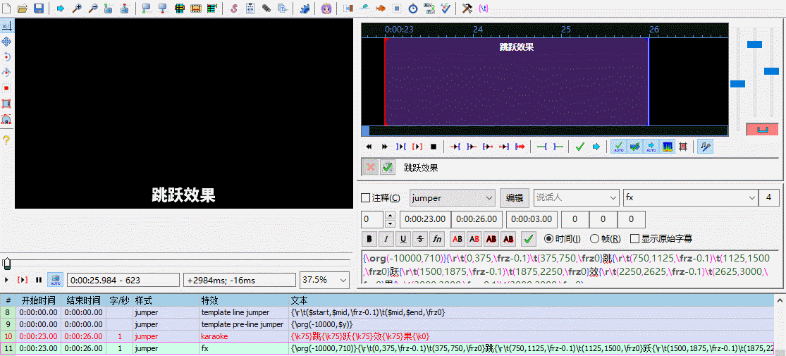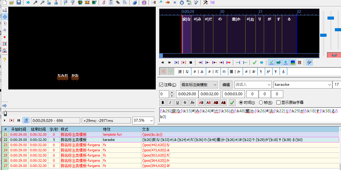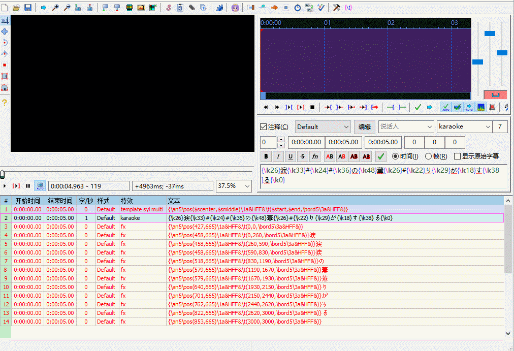 - 如果在特效栏看到Karaoke,karaoke 或者是空白的,这行就是打好时间的karaoke行。