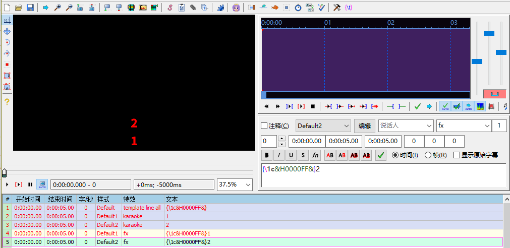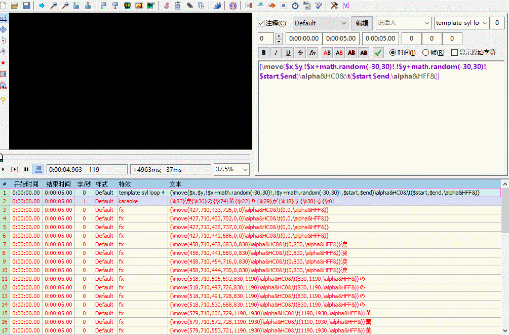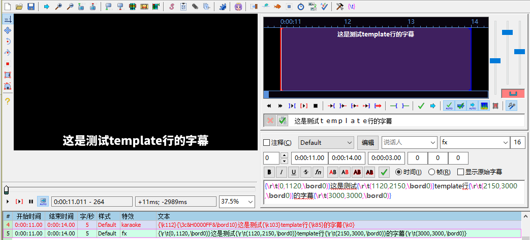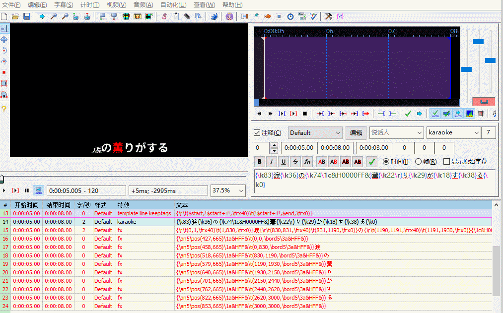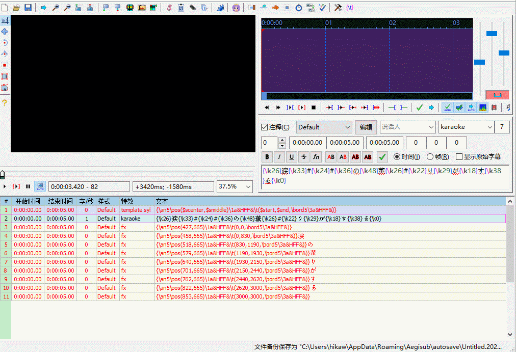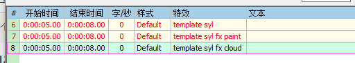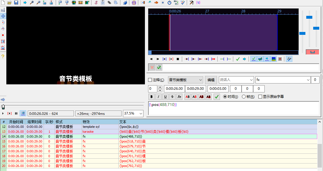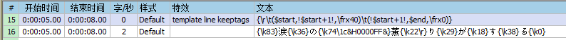 - 如果在特效栏看到 fx,这行就是karaoke行被应用模板后生成的行,执行自动化模板时,这些行首先会被删除。