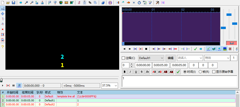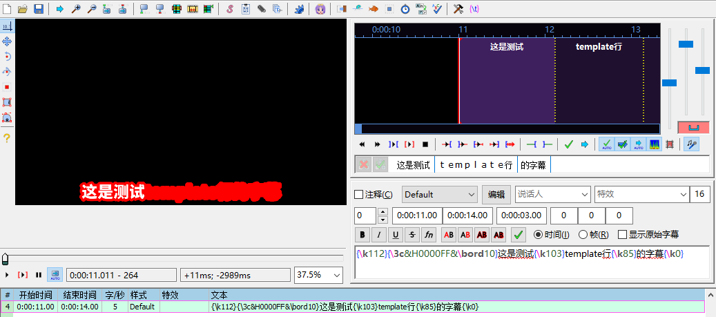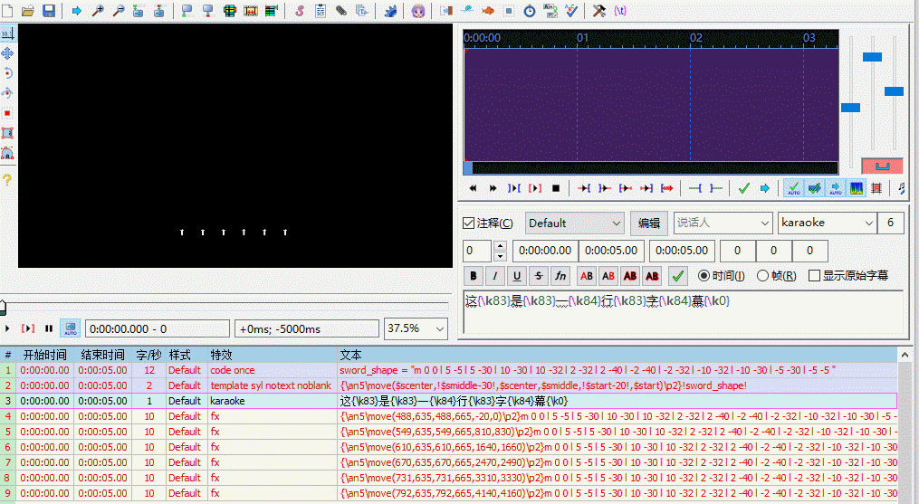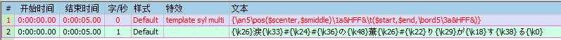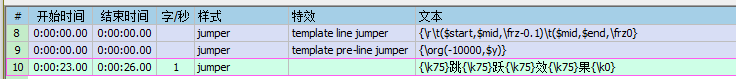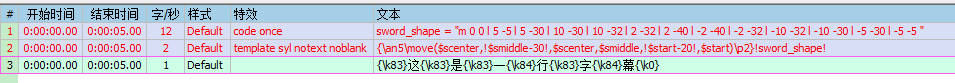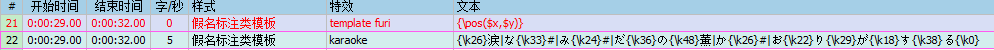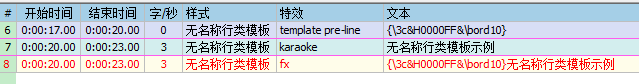- 在特效栏,第一个被空格分隔的单词决定了该行是template行还是code行,是打好时间的karaoke行,还是设置好样式(被应用模板后)的karaoke行抑或其他的东西。