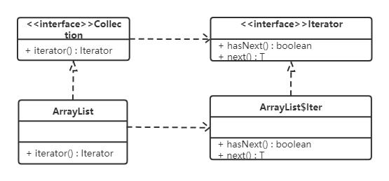 Collection接口是抽象工厂类,ArrayList是具体的工厂类;Iterator接口是抽象商品类,ArrayList类中的Iter内部类是具体的商品类。在具体的工厂类中iterator()方法创建具体的商品类的对象。