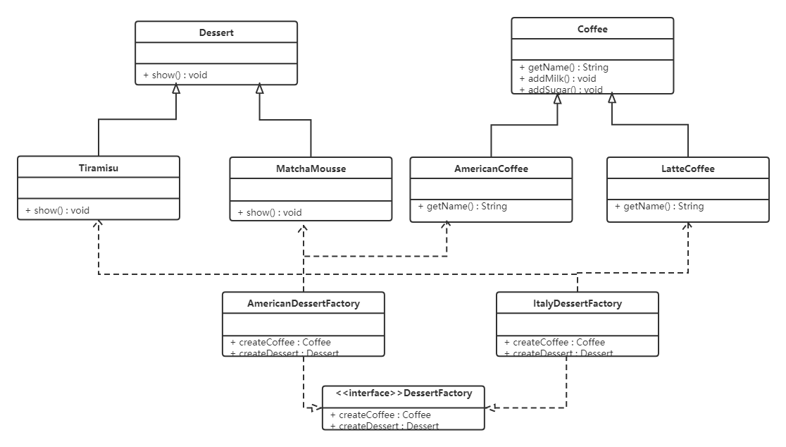 现咖啡店业务发生改变,不仅要生产咖啡还要生产甜点,如提拉米苏、抹茶慕斯等,要是按照工厂方法模式,需要定义提拉米苏类、抹茶慕斯类、提拉米苏工厂、抹茶慕斯工厂、甜点工厂类,很容易发生类爆炸情况。其中拿铁咖啡、美式咖啡是一个产品等级,都是咖啡;提拉米苏、抹茶慕斯也是一个产品等级;拿铁咖啡和提拉米苏是同一产品族(也就是都属于意大利风味),美式咖啡和抹茶慕斯是同一产品族(也就是都属于美式风味)。所以这个案例可以使用抽象工厂模式实现。类图如下: